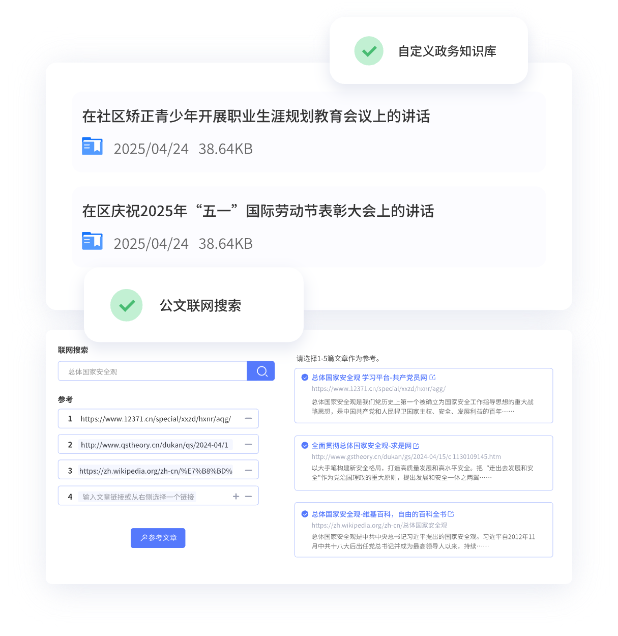 上傳政務或個人寫作常用材料,用于精準生成符合自己寫作風格的公文
